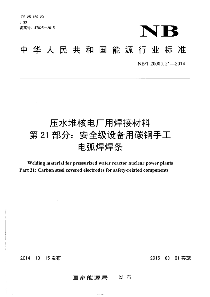 NB/T 20009.21-2014 压水堆核电厂用焊接材料 第21部分:安全级设备用碳钢手工电弧焊焊条