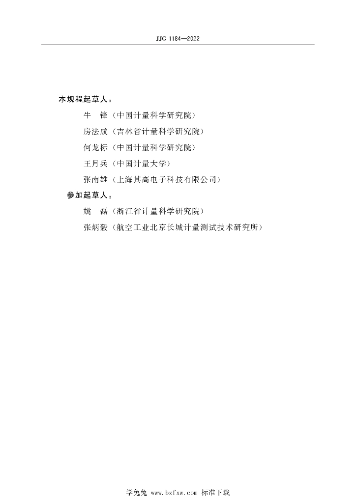 牛锋(中国计量科学研究院)、房法成(吉林省计量科学研究院)、何龙标(中国计量科学研究院)、王月兵(中国计量大学)、张南雄(上海其高电子科技有限公司)、姚磊(浙江省计量科学研究院)、张炳毅(航空工业北京长城计量测试技术研究所)