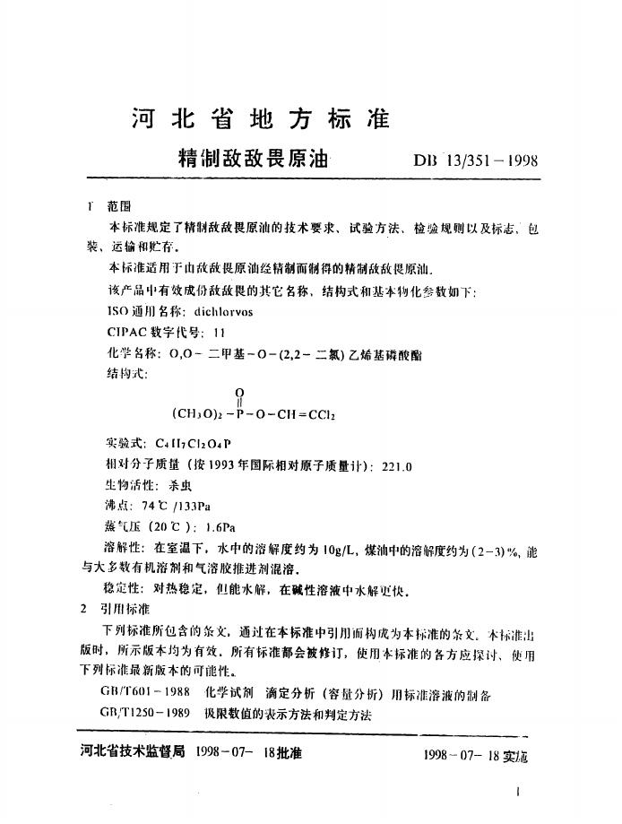 DB13/ 351-1998 精制敌敌畏原油