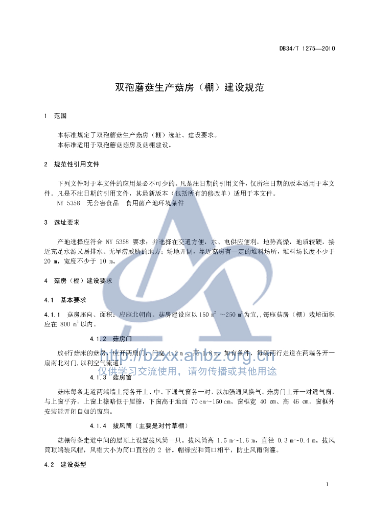 DB34/T 1275-2010 双孢蘑菇生产菇房(棚)建设规范