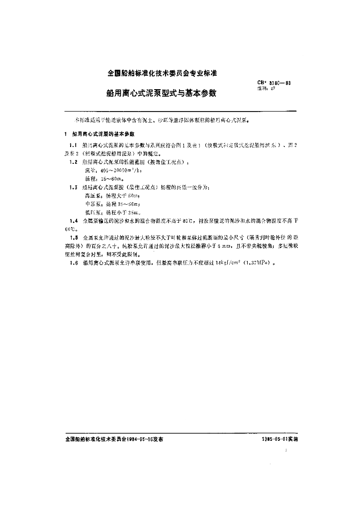 CB 3180-1983 船用离心式泥泵型式与基本参数