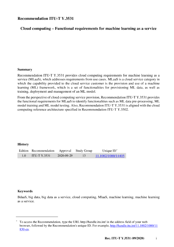 ITU-T Y.3531-2020 云计算 机器学习即服务的功能要求(英文版)
