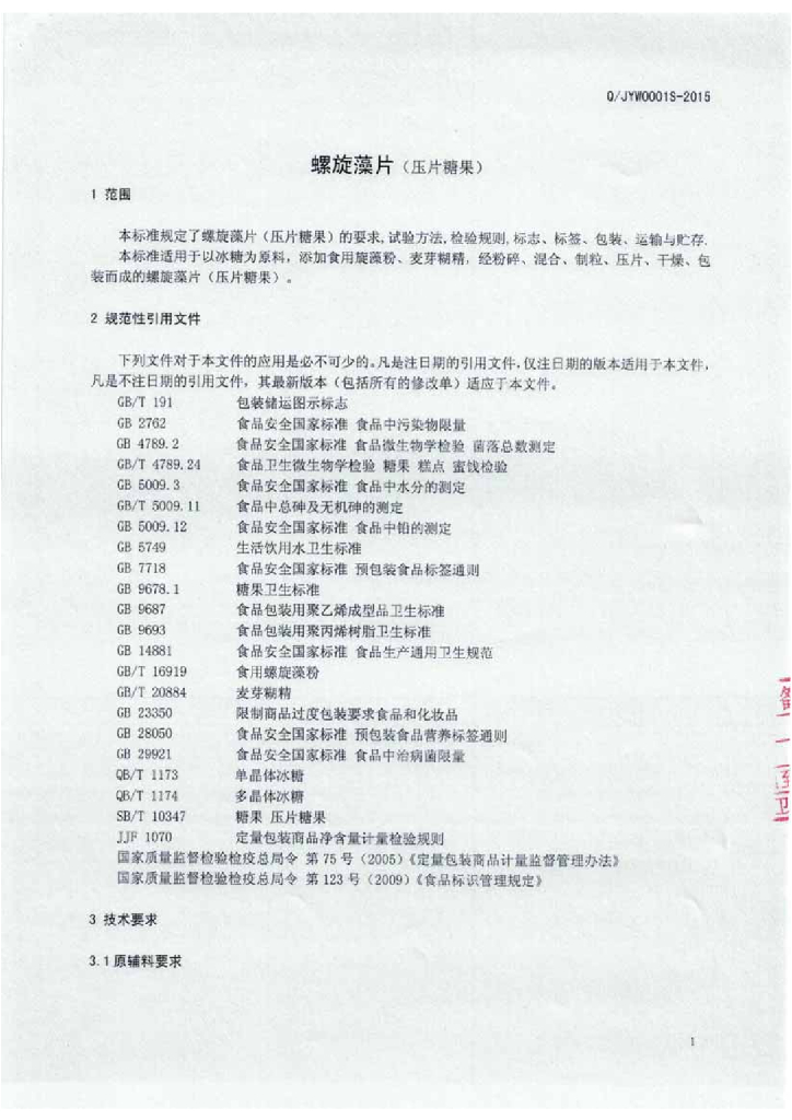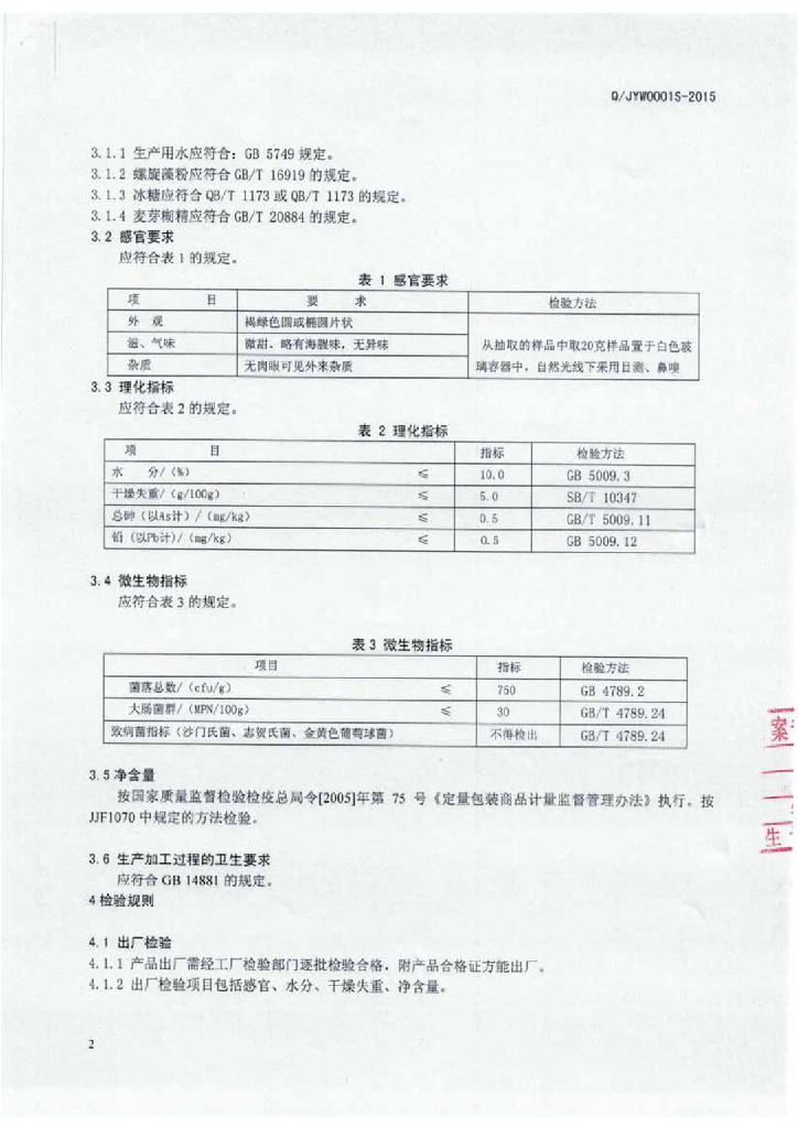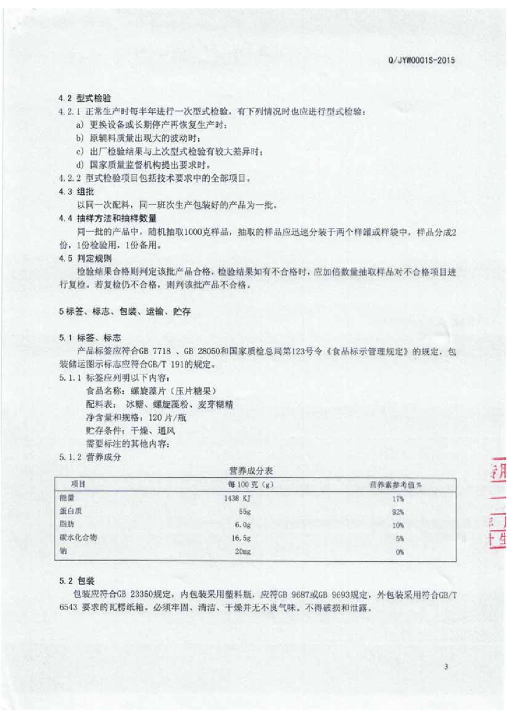 Q/JYW 0001S-2015 吉林一王生物制品有限公司 螺旋藻片(压片糖果)