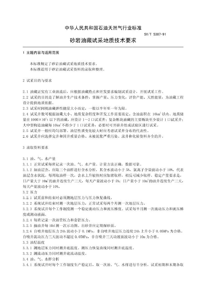 SY/T 5387-1991 砂岩油藏试采地质技术要求