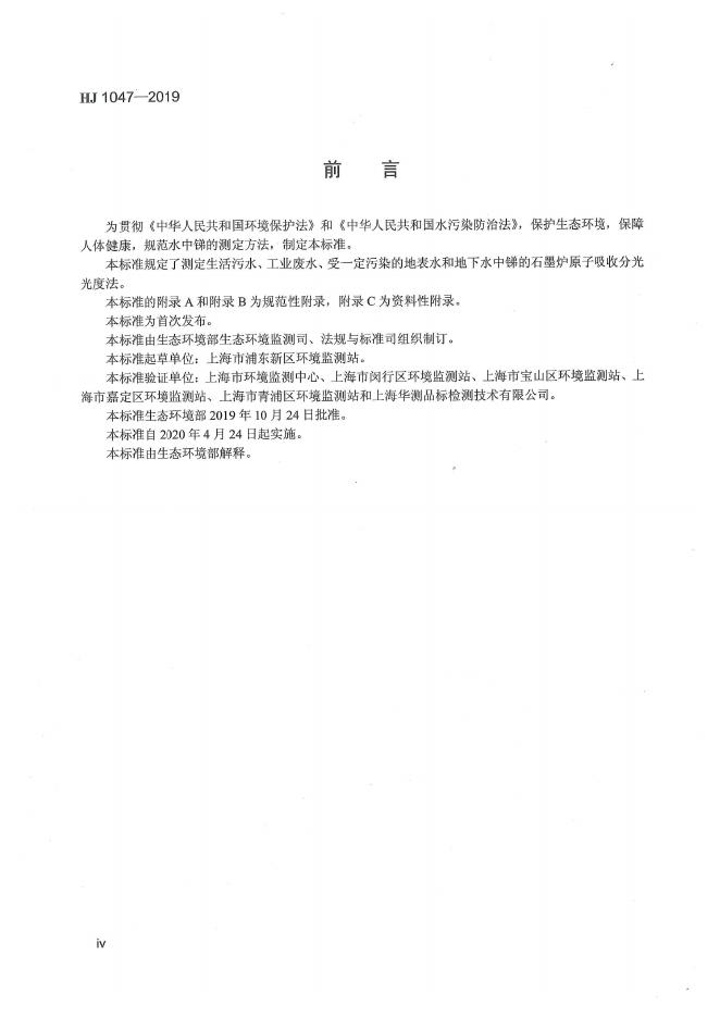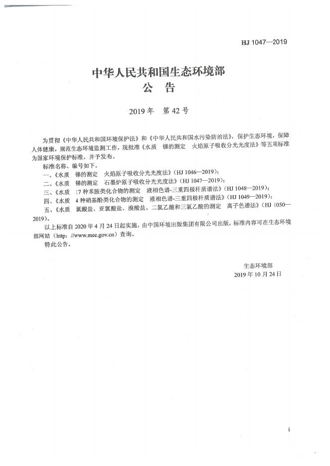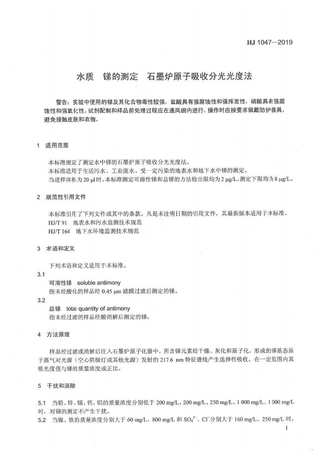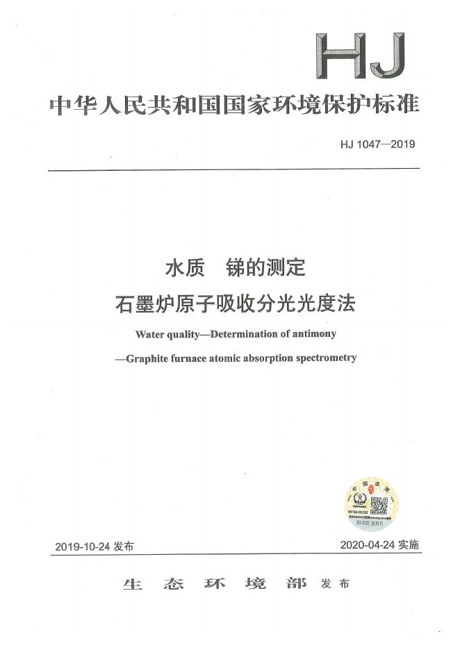 HJ 1047-2019 水质 锑的测定 石墨炉原子吸收分光光度法