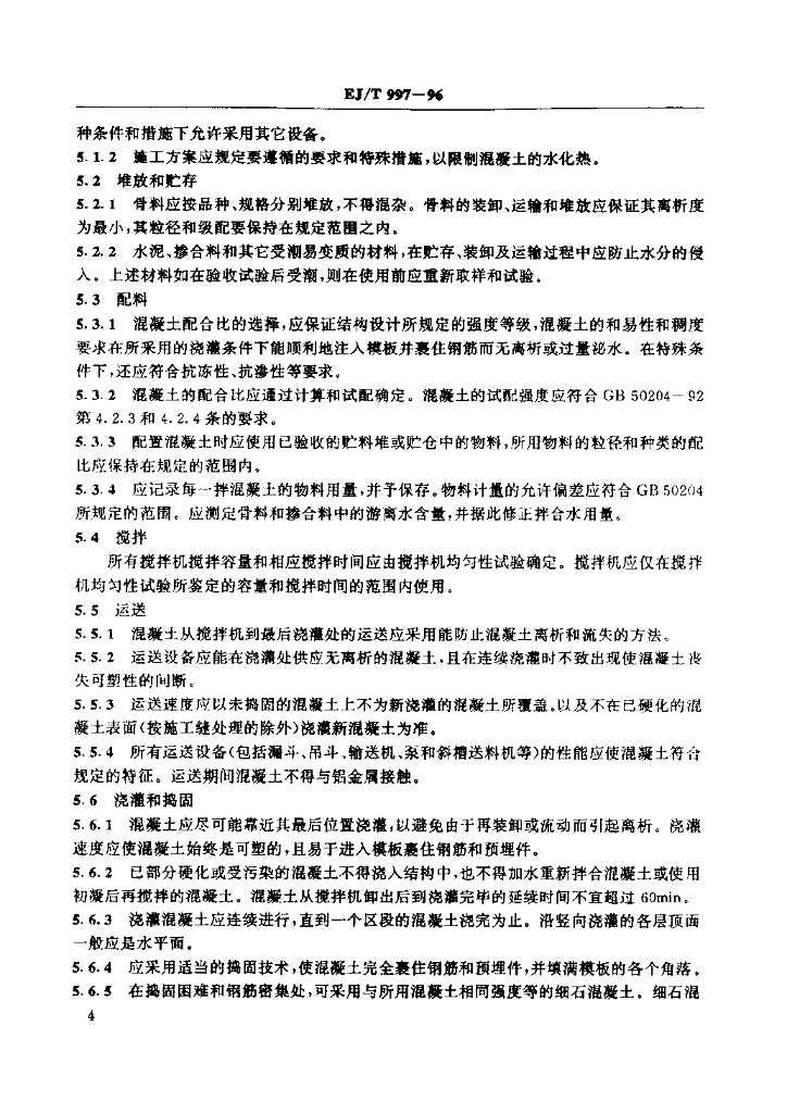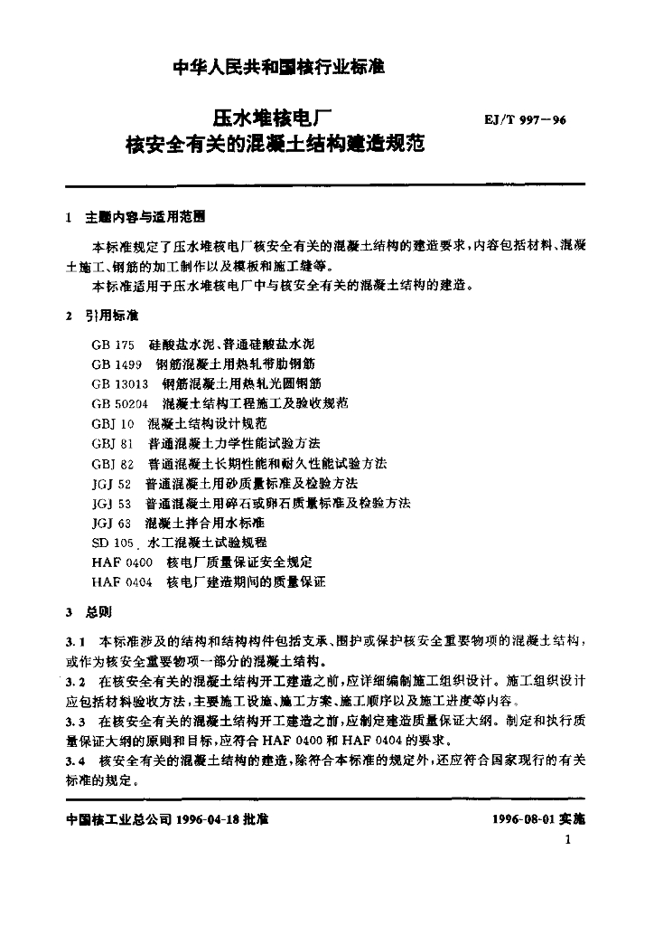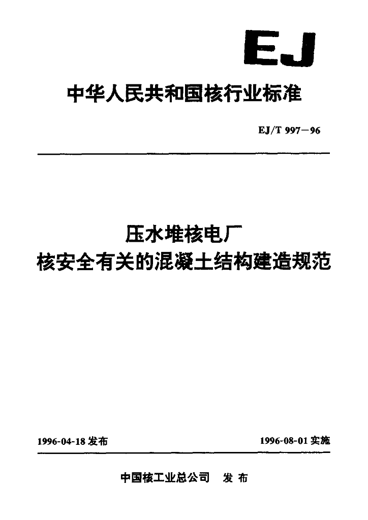 EJ/T 997-1996 压水堆核电厂核安全有关的混凝土结构建造规范