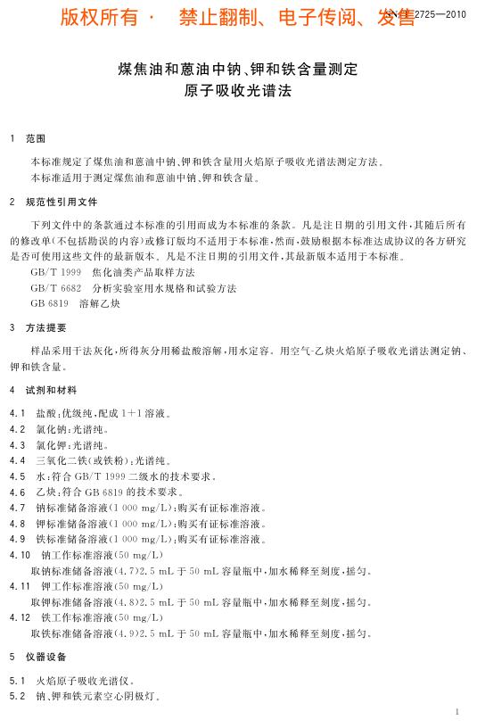 SN/T 2725-2010 煤焦油和蒽油中钠、钾和铁含量测定 原子吸收光谱法