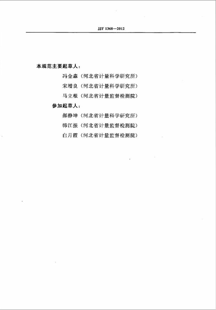 冯金淼(河北省计量科学研究所)、宋增良(河北省计量科学研究所)、马立根(河北省计量监督检测院)、郝静坤(河北省计量科学研究所)、韩江振(河北省计量监督检测院)、白月霞(河北省计量监督检测院)