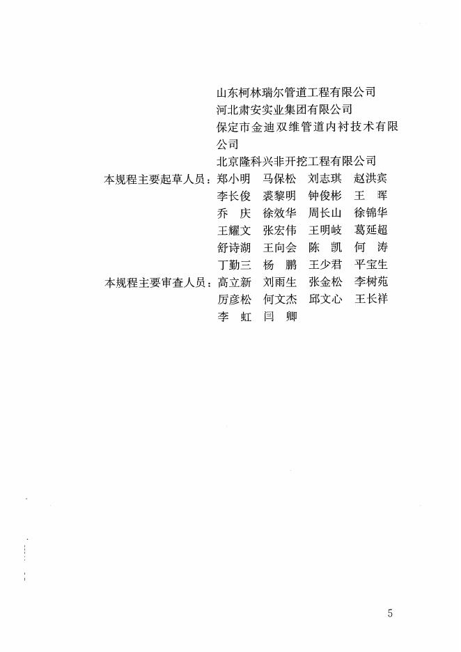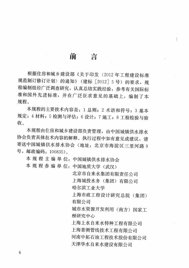 中国城镇供水排水协会、中国地质大学(武汉)、北京市自来水集团有限责任公司、上海城投水务(集团)有限公司、哈尔滨工业大学、上海市政工程设计研究总院(集团)有限公司、城市水资源开发利用(南方)国家工程研究中心、上海上水自来水特种工程有限公司、上海普测管线技术工程有限公司、河南中拓石油工程技术股份有限公司、天津华水自来水建设有限公司、山东柯林瑞尔管道工程有限公司、河北肃安实业集团有限公司、保定市金迪双维管道内衬技术有限公司、北京隆科兴非开挖工程有限公司