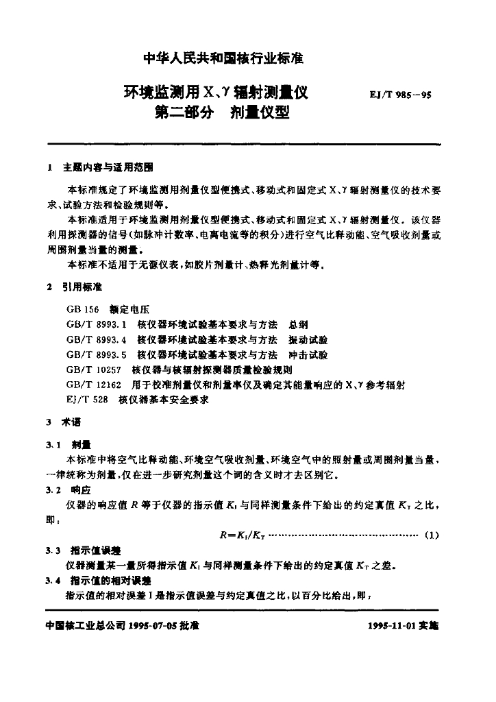 EJ/T 985-1995 环境监测用X、γ辐射测量仪 第二部分 剂量仪型
