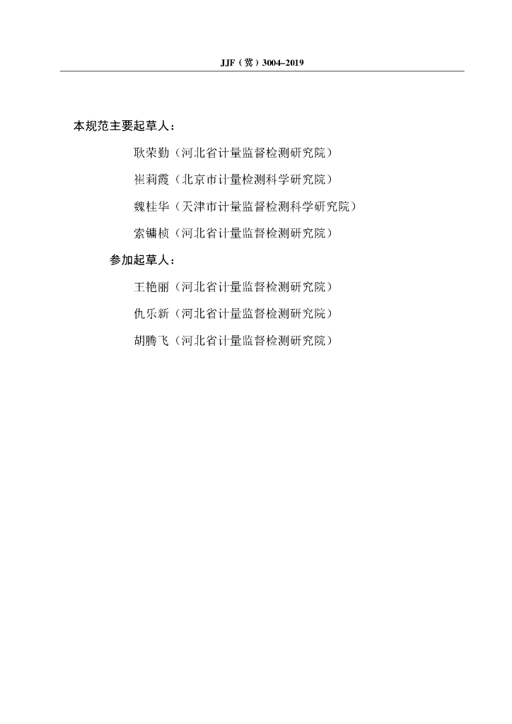 耿荣勤(河北省计量监督检测研究院)、崔莉霞(北京市计量检测科学研究院)、魏桂华(天津市计量监督检测科学研究院)、索镛桢(河北省计量监督检测研究院)、王艳丽(河北省计量监督检测研究院)、仇乐新(河北省计量监督检测研究院)、胡腾飞(河北省计量监督检测研究院)