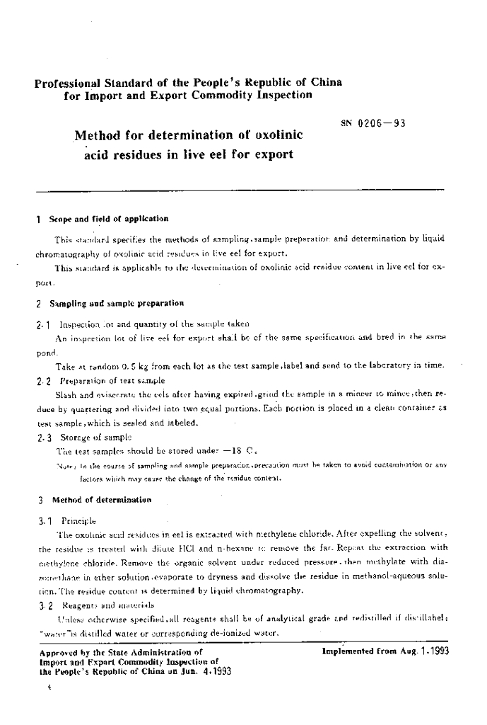 SN 0206-1993 出口活鳗鱼中喹酸残留量检验方法