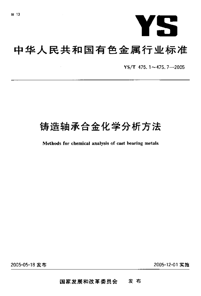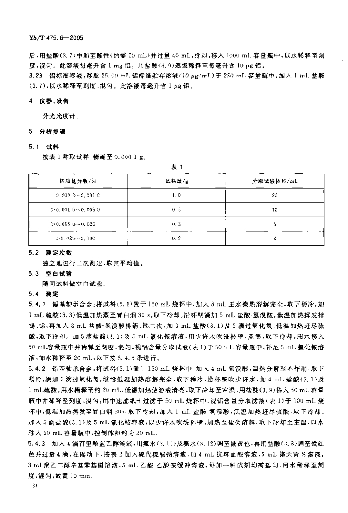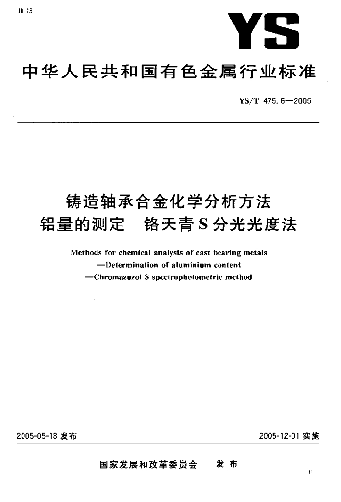 YS/T 475.6-2005 铸造轴承合金化学分析方法铝量的测定铬天青S分光光度法