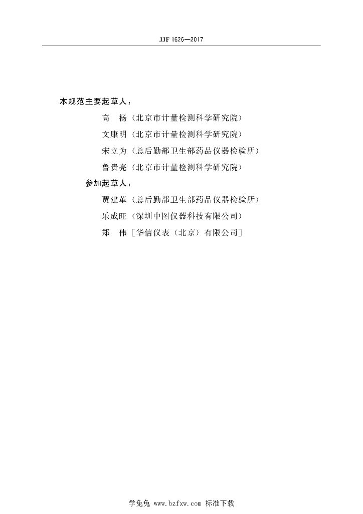 高杨(北京市计量检测科学研究院)、文康明(北京市计量检测科学研究院)、宋立为(总后勤部卫生部药品仪器检验所)、鲁贵亮(北京市计量检测科学研究院)、贾建革(总后勤部卫生部药品仪器检验所)、乐成旺(深圳中图仪器科技有限公司)、郑伟(华信仪表(北京)有限公司)