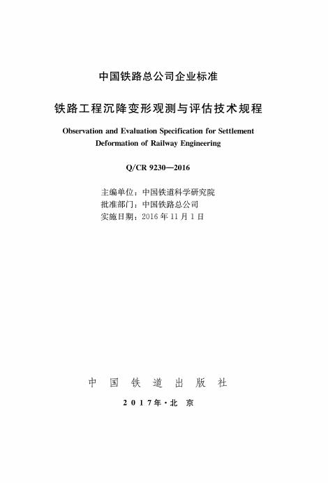 Q/CR 9230-2016 铁路工程沉降变形观测及评估技术规程(附条文说明)