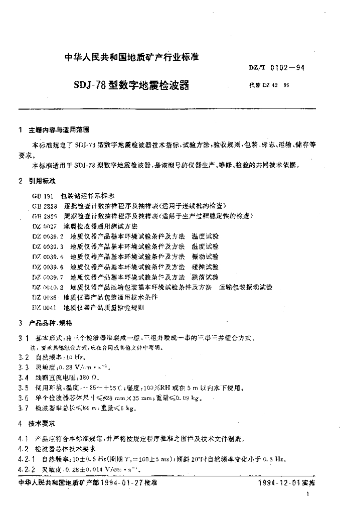DZ/T 0102-1994 SDJ-78 型数字地震检波器