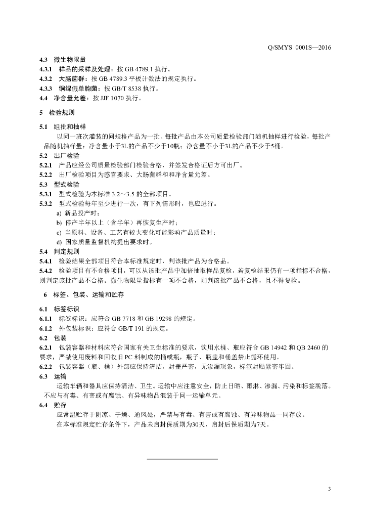 Q/SMYS 0001S-2016 陕西明月山饮品有限公司 包装饮用水