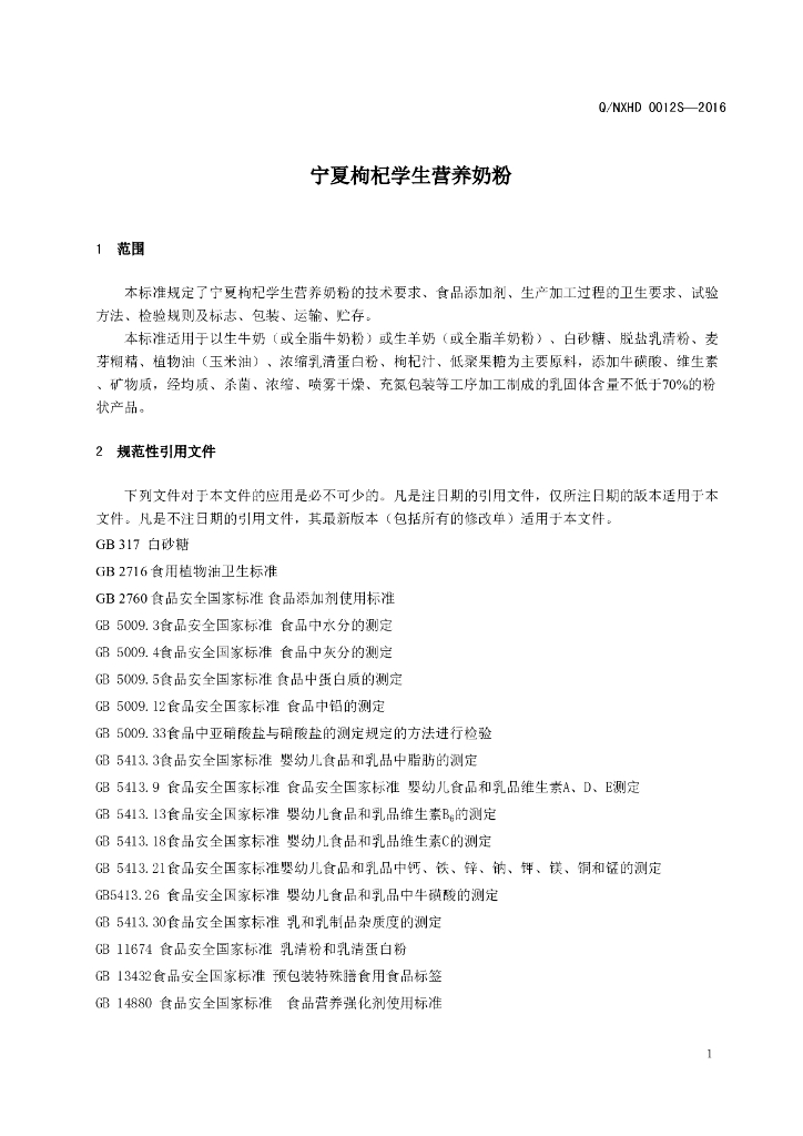 Q/NXHD 0012S-2016 宁夏恒大乳业有限公司 宁夏枸杞学生营养奶粉