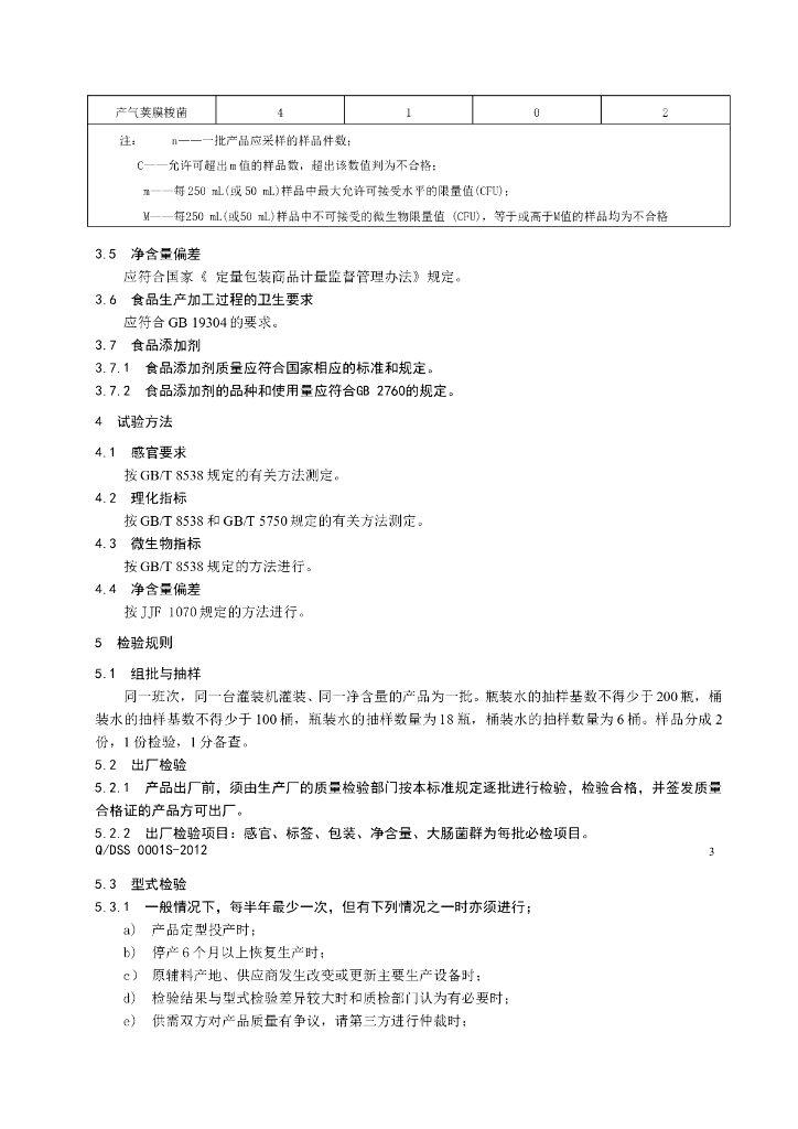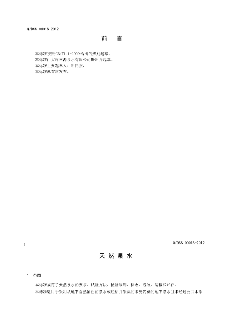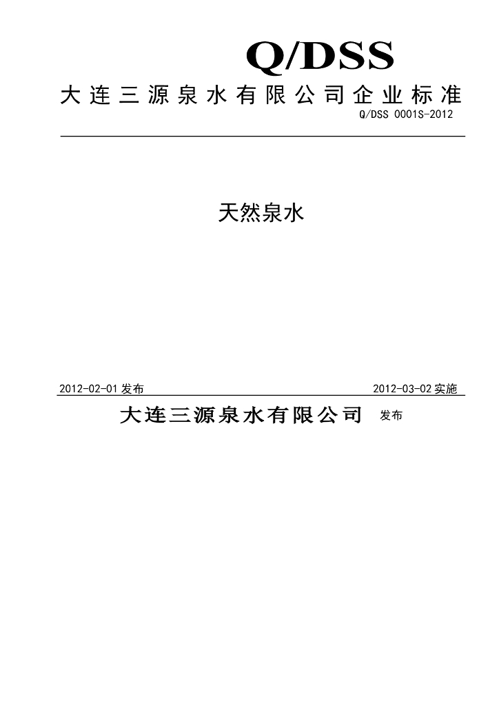 Q/DSS 0001S-2012 天然泉水