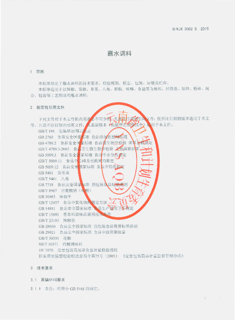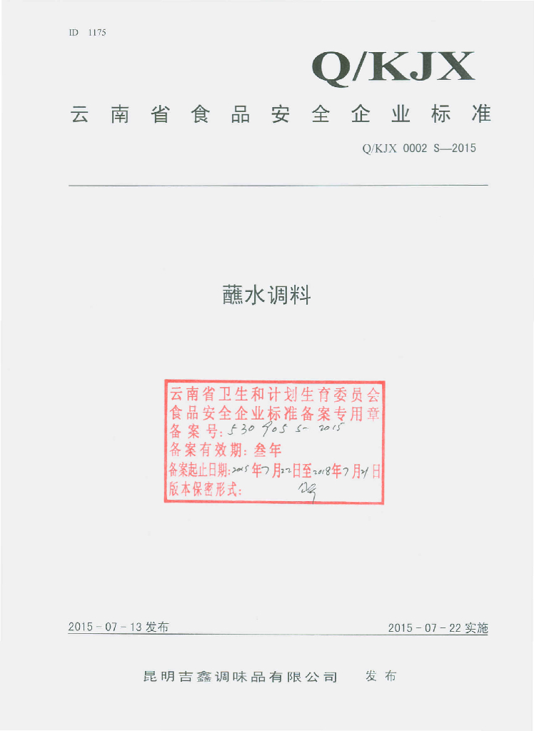 Q/KJX 0002S-2015 昆明吉鑫调味品有限公司 蘸水调料