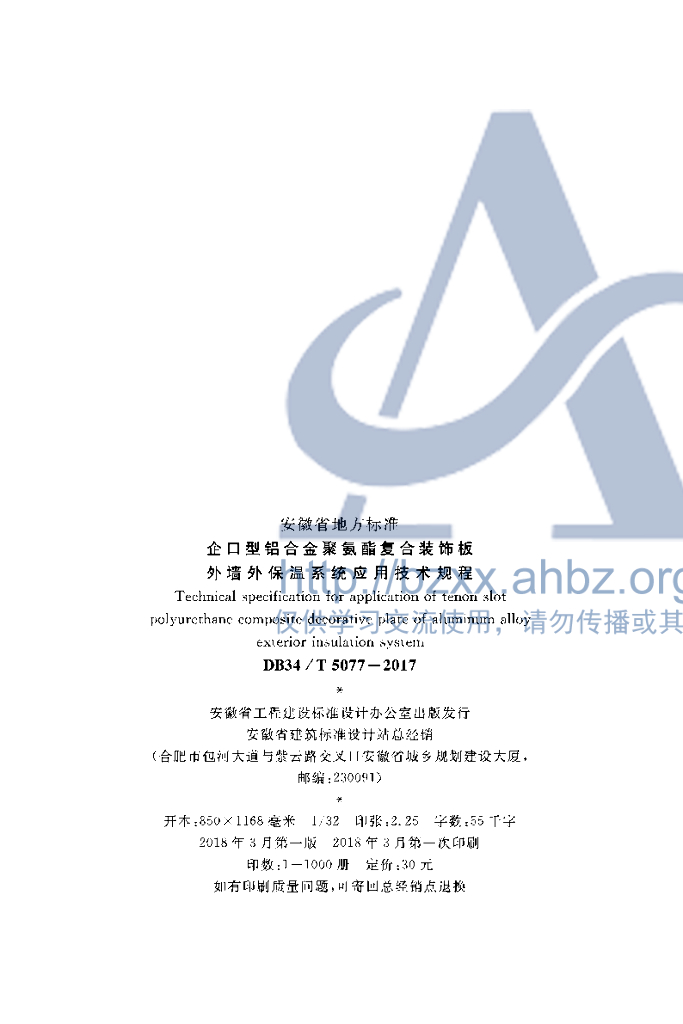 DB34/T 5077-2017 企口型铝合金聚氨酯复合装饰板外墙外保温应用技术规程