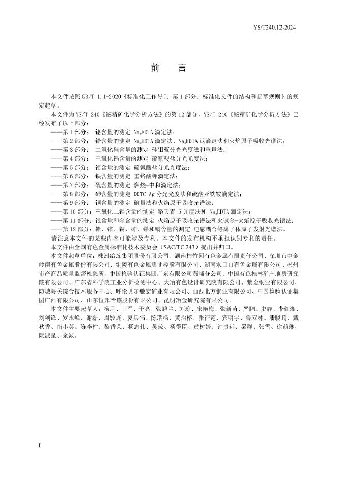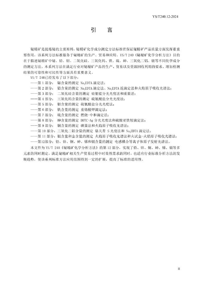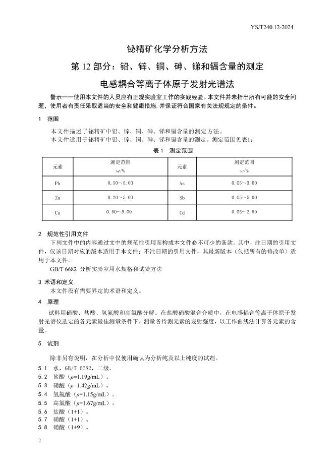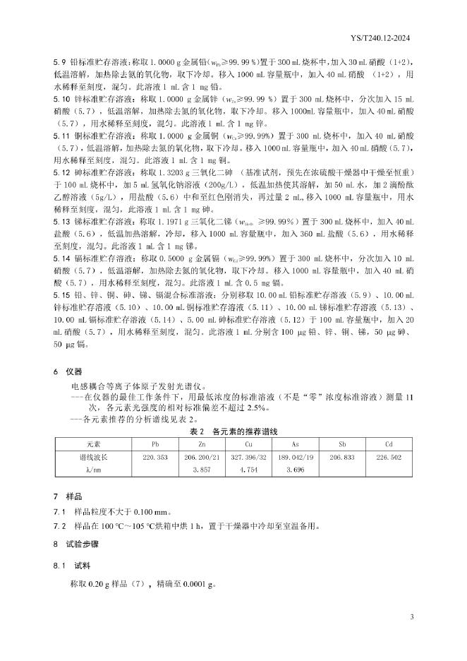 YS/T 240.12-2024 铋精矿化学分析方法 第12部分:铅、锌、铜、砷、锑和镉含量的测定 电感耦合等离子体原子发射光谱法