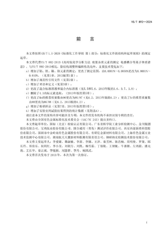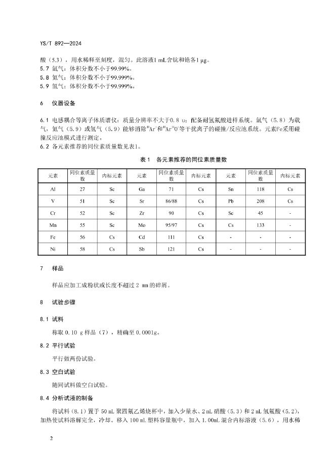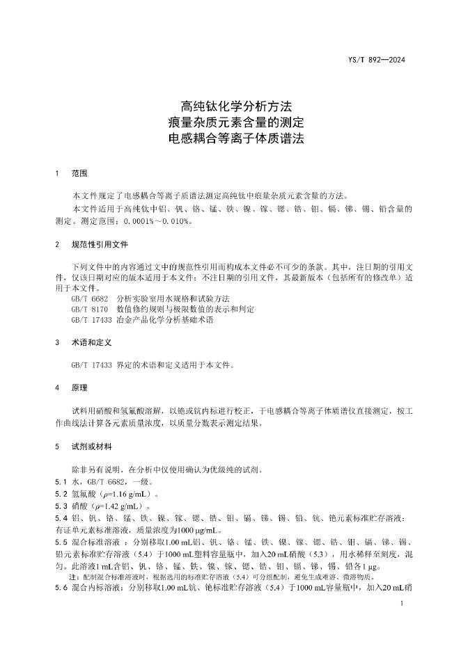 YS/T 892-2024 高纯钛化学分析方法 痕量杂质元素含量的测定 电感耦合等离子体质谱法