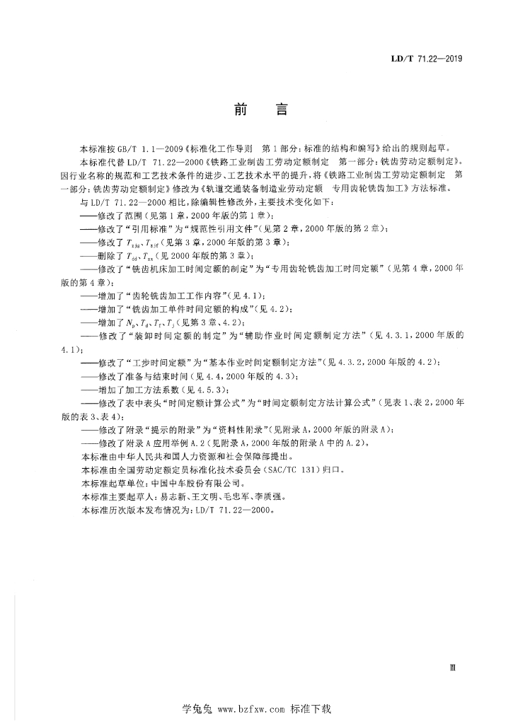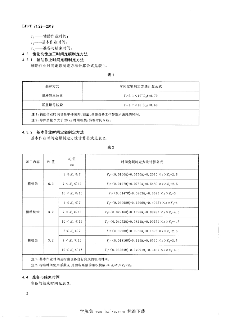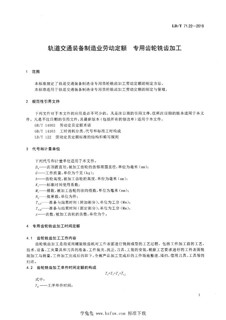 LD/T 71.22-2019 轨道交通装备制造业劳动定额 专用齿轮铣齿加工