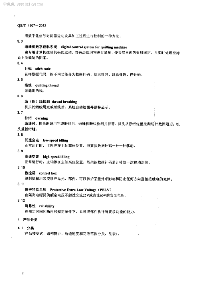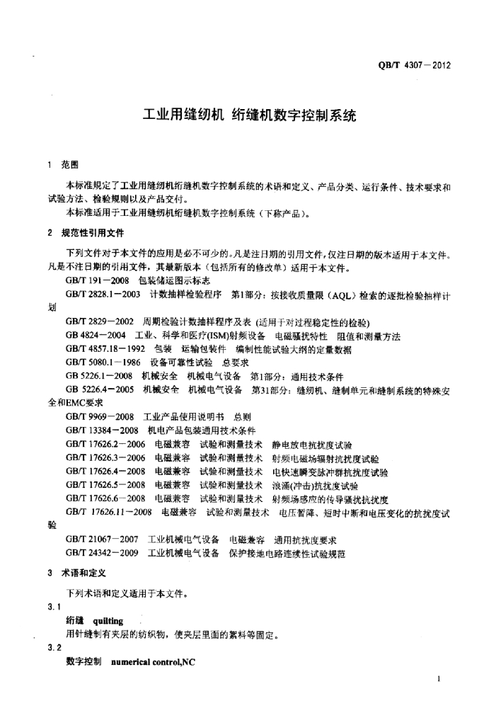 QB/T 4307-2012 工业用缝纫机绗缝机数字控制系统