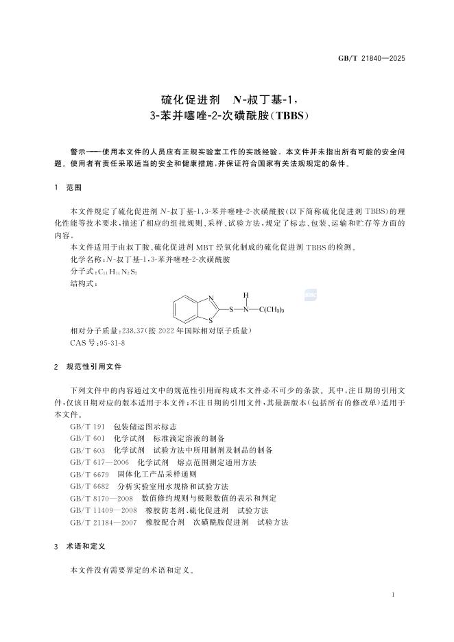 GB/T 21840-2025 硫化促进剂 N-叔丁基-1,3-苯并噻唑-2-次磺酰胺(TBBS)