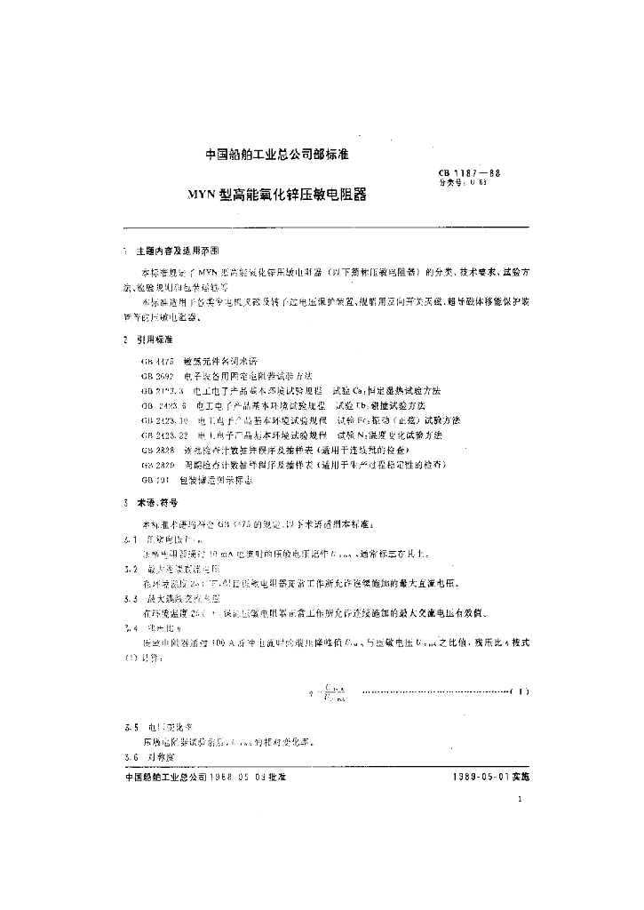 CB 1187-1988 MYN 型高能氧化锌压敏电阻器