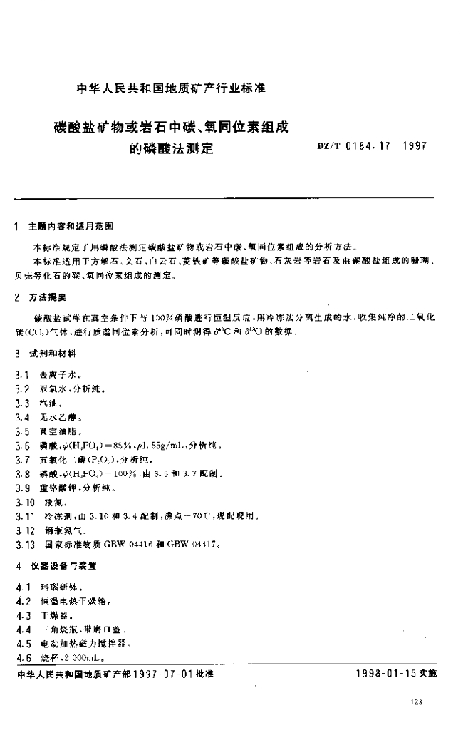 DZ/T 0184.17-1997 碳酸盐矿物或岩石中碳、氧同位素组成的磷酸法测定