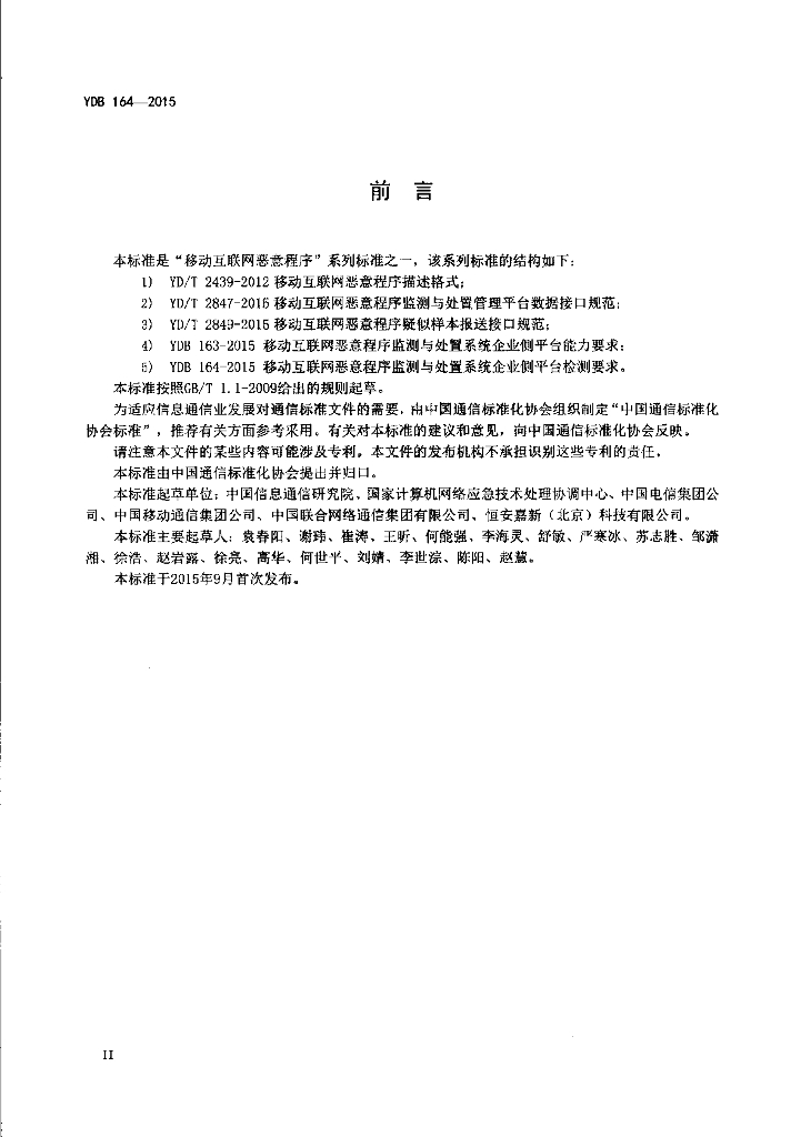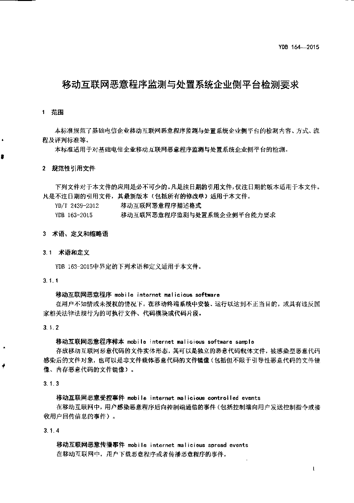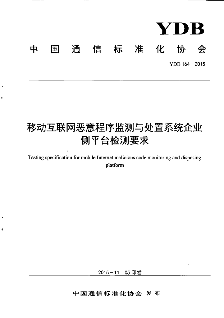 YDB 164-2015 移动互联网恶意程序监测与处置系统企业侧平台检测要求