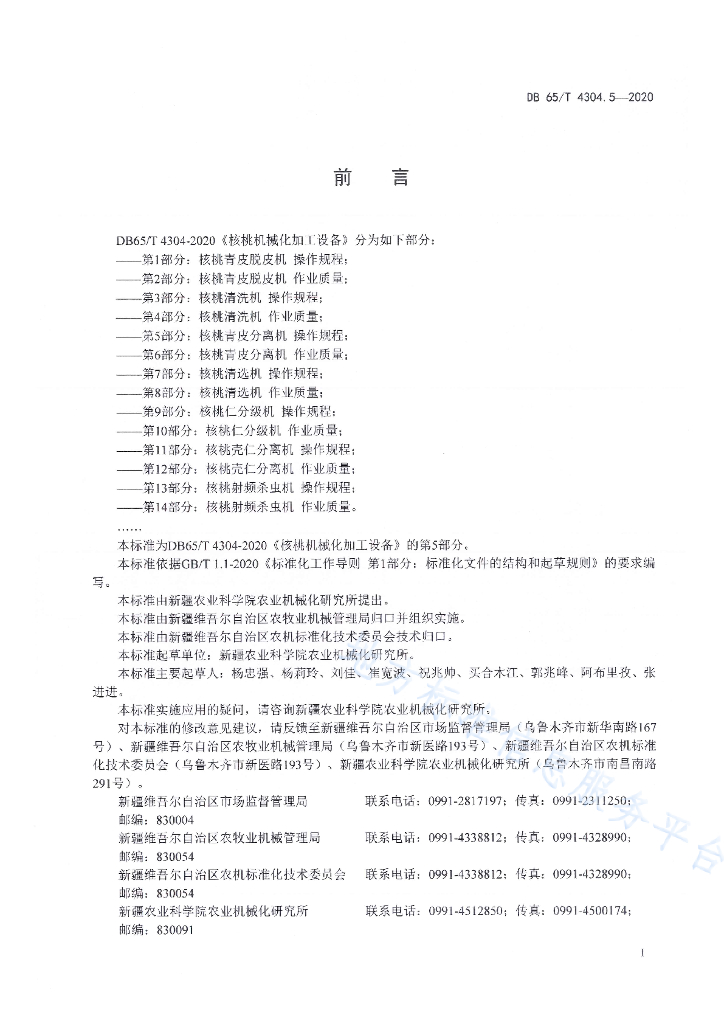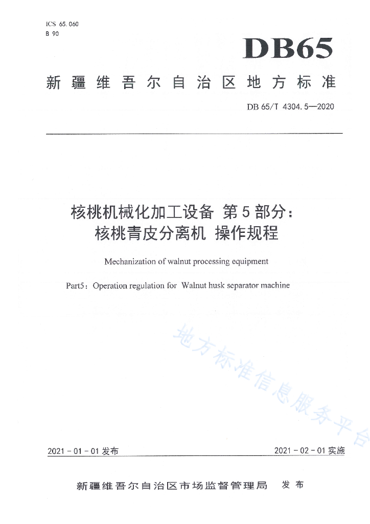 DB65/T 4304.5-2020 核桃机械化加工设备 第5部分:核桃青皮分离机 操作规程