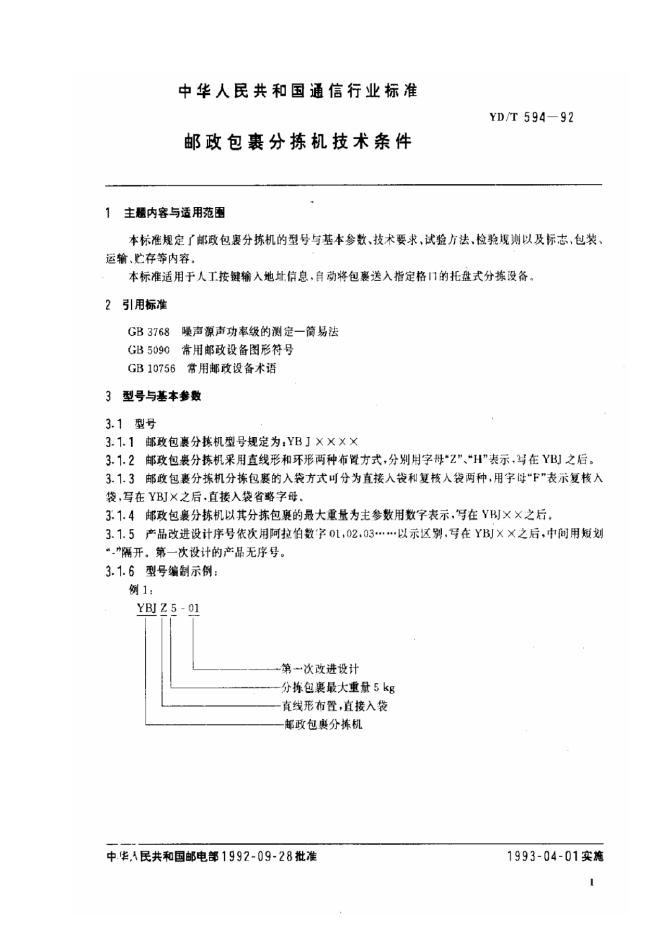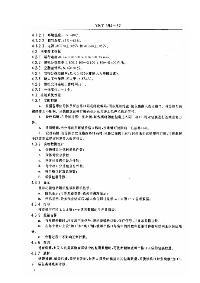 YD/T 594-1992 邮政包裹分拣机 技术条件