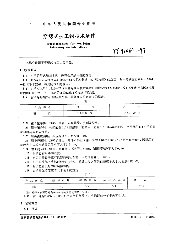 YY 91067-1999 穿鳃式技工钳
