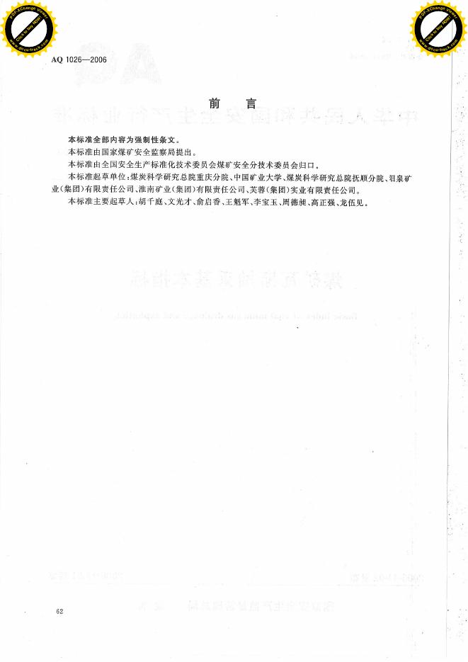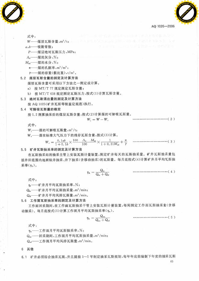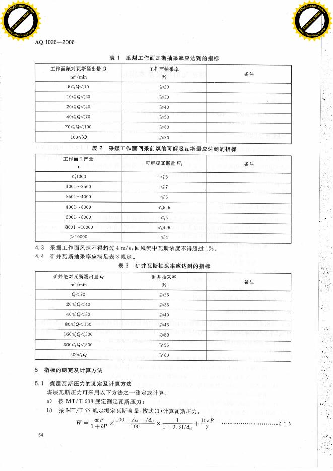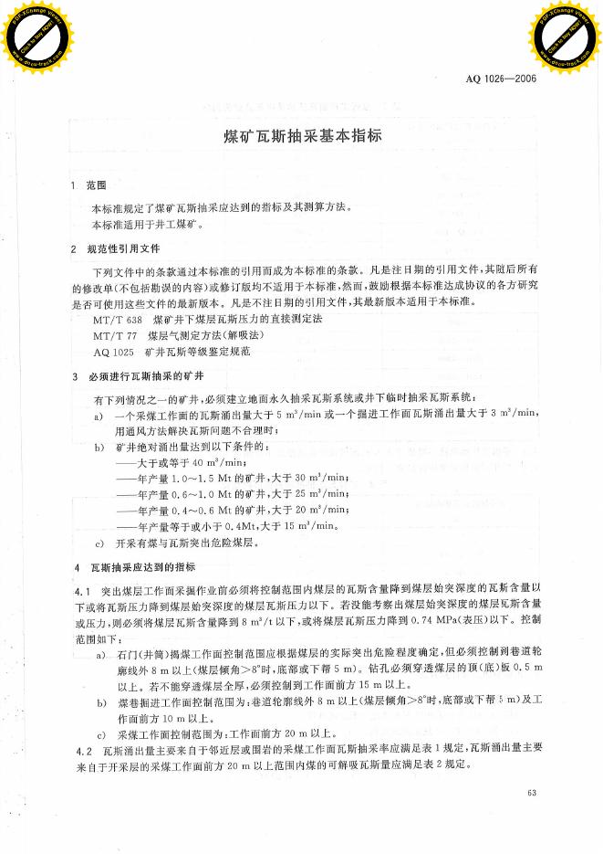 AQ 1026-2006 煤矿瓦斯抽采基本指标