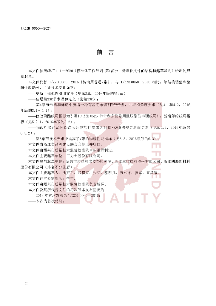 本标准由绍兴市质量技术监督检测院牵头组织制订。、本标准主要起草单位:三力士股份有限公司。、本标准参与起草单位:绍兴市质量技术监督检测院、浙江三维橡胶股份有限公司、浙江四海橡胶有限公司(排名不分先后)。