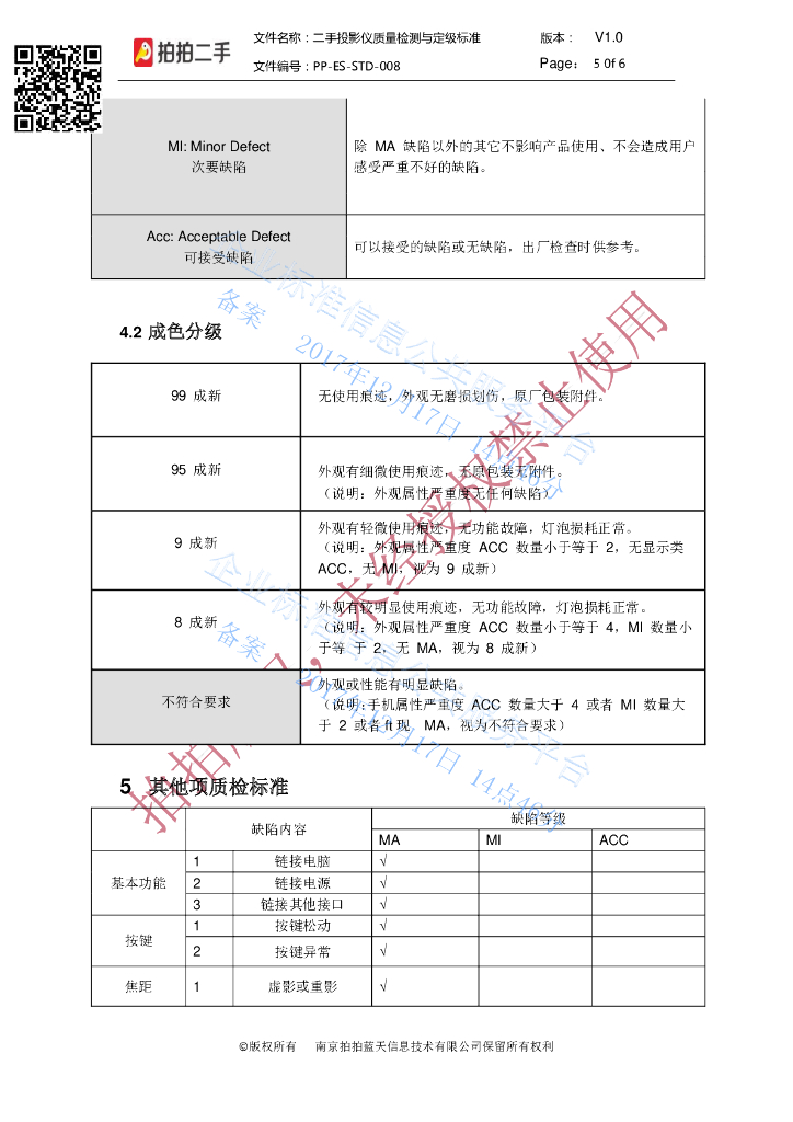 Q/PPESSTD 008-2017 二手投影仪质量检测与定级标准