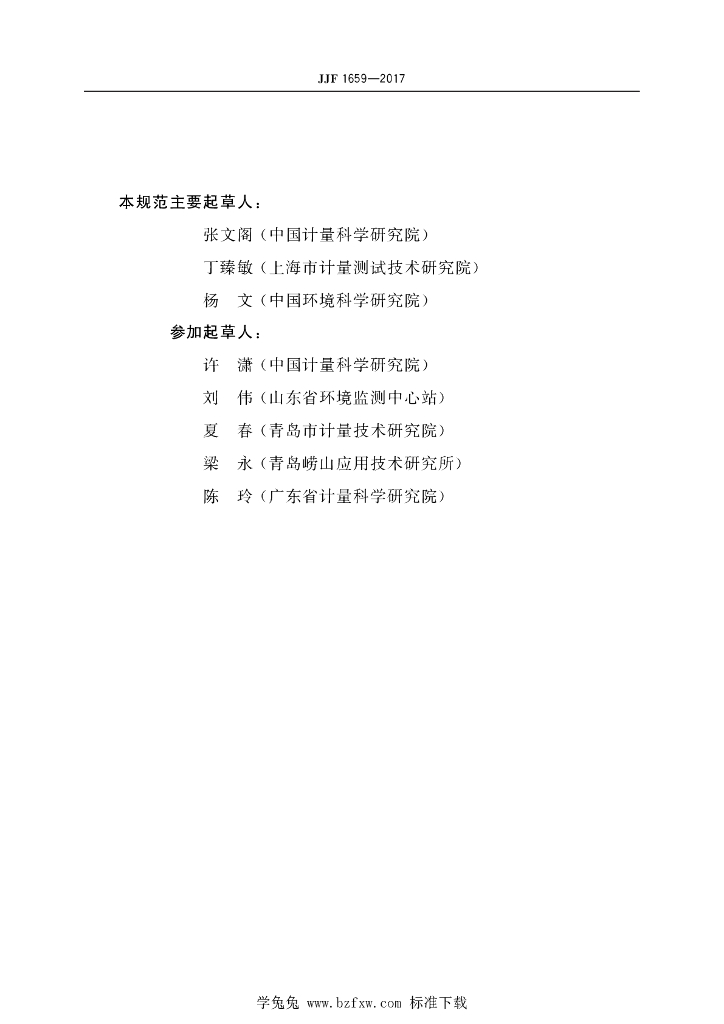 张文阁(中国计量科学研究院)、丁臻敏(上海市计量测试技术研究院)、杨文(中国环境科学研究院)、许潇(中国计量科学研究院)、刘伟(山东省环境监测中心站)、夏春(青岛市计量技术研究院)、梁永(青岛唠山应用技术研究所)、陈玲(广东省计量科学研究院)