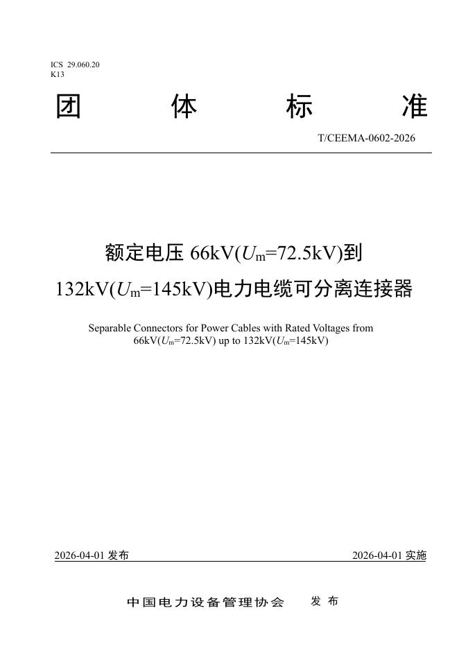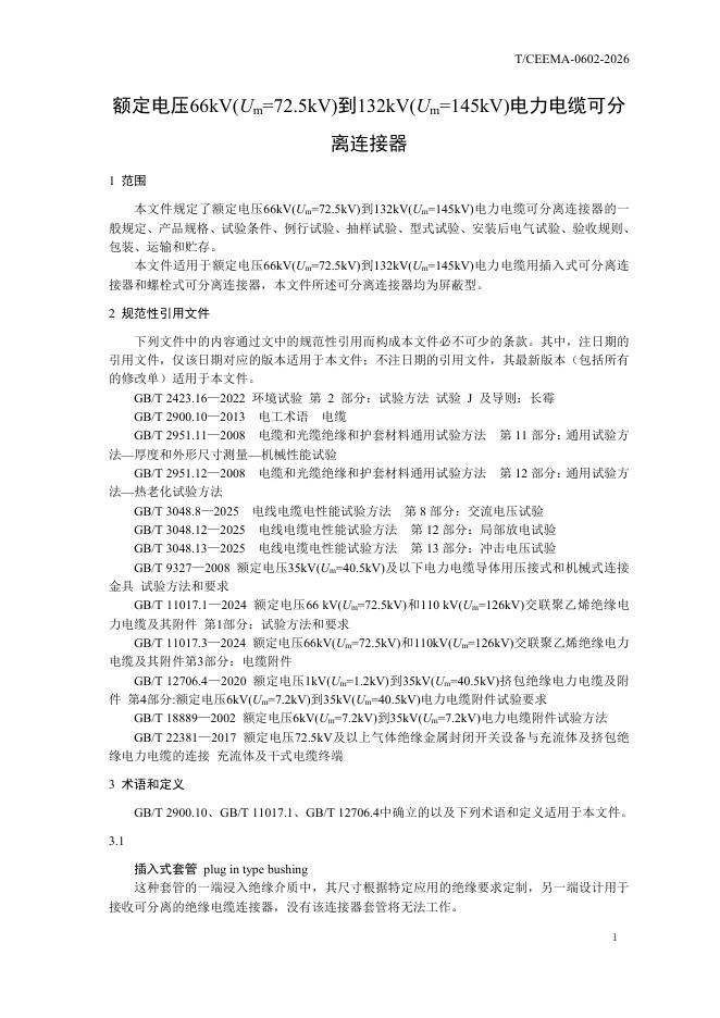 T/CEEMA 0602-2026 额定电压66kV(Um=72.5kV)到132kV(Um=145kV)电力电缆可分离连接器