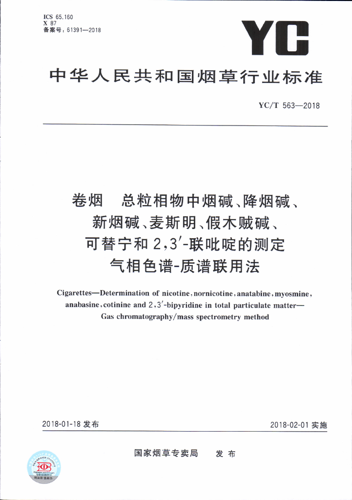 YC/T 563-2018 卷烟 总粒相物中烟碱、降烟碱、新烟碱、麦斯明、假木贼碱、可替宁和2,3′-联吡啶的测定 气相色谱-质谱联用法