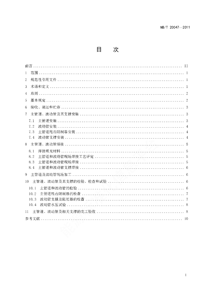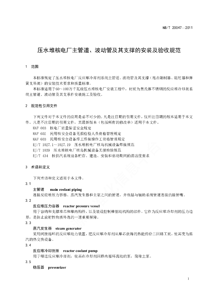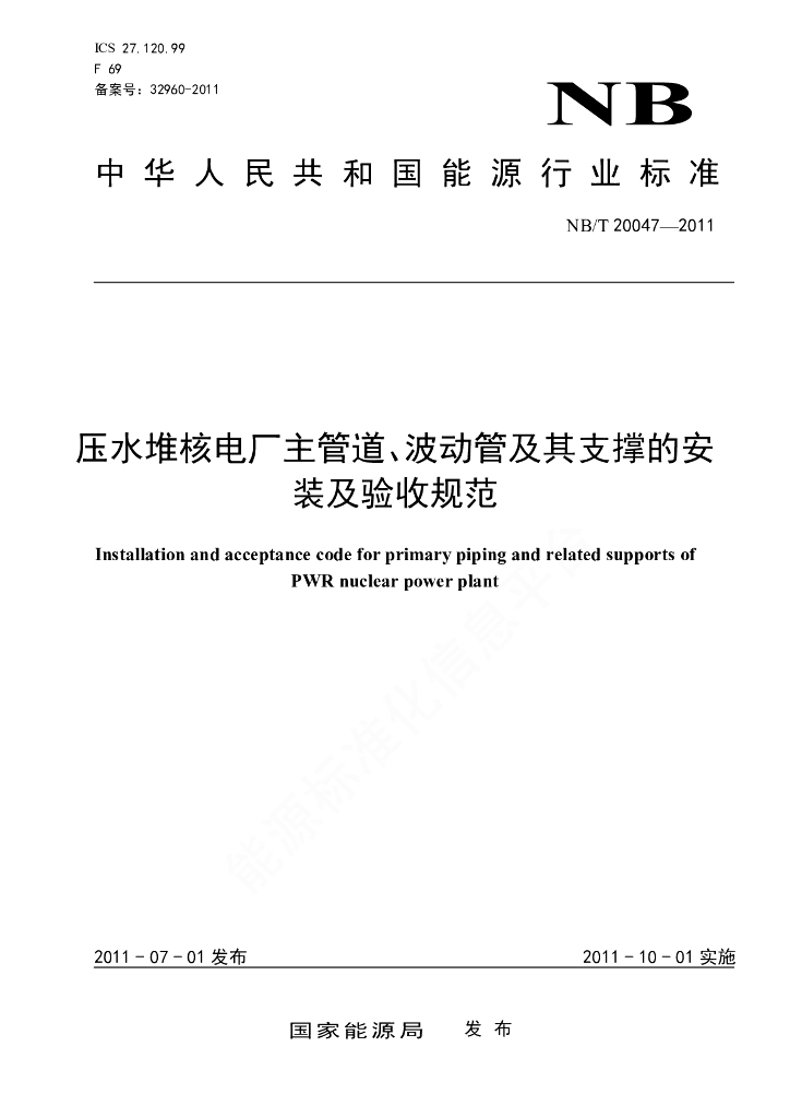NB/T 20047-2011 压水堆核电厂主管道、波动管及其支撑的安装及验收规范