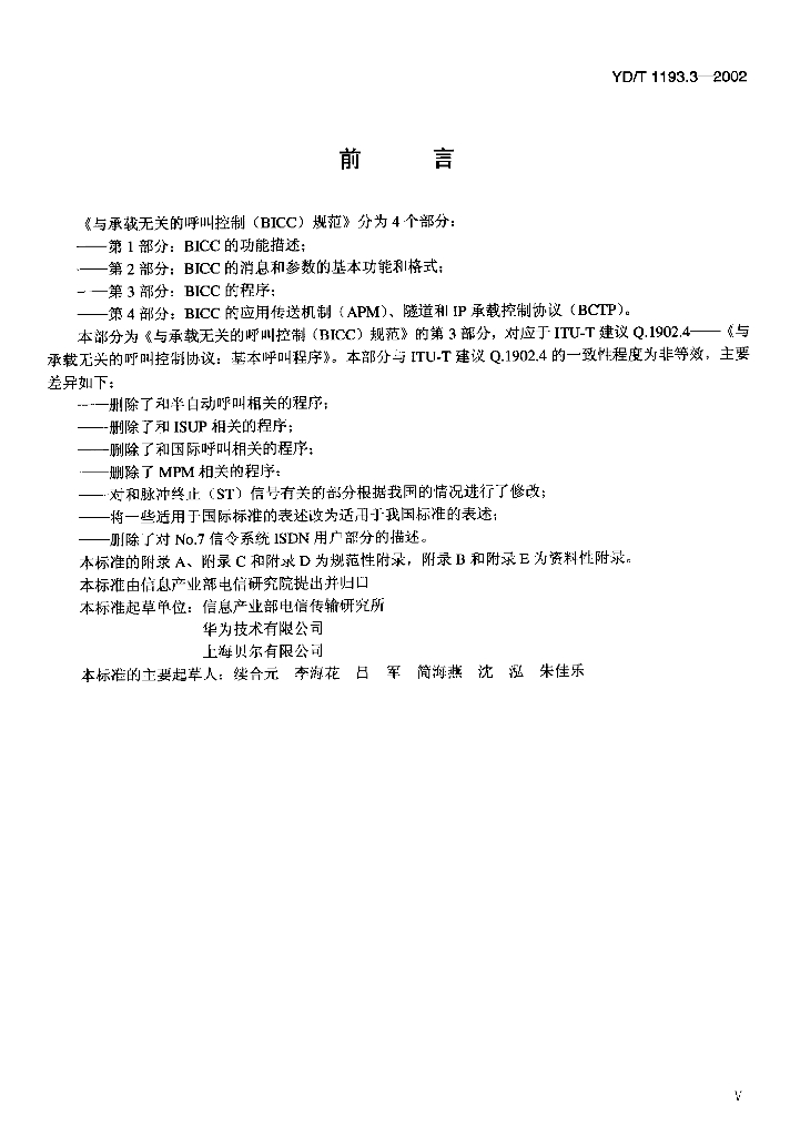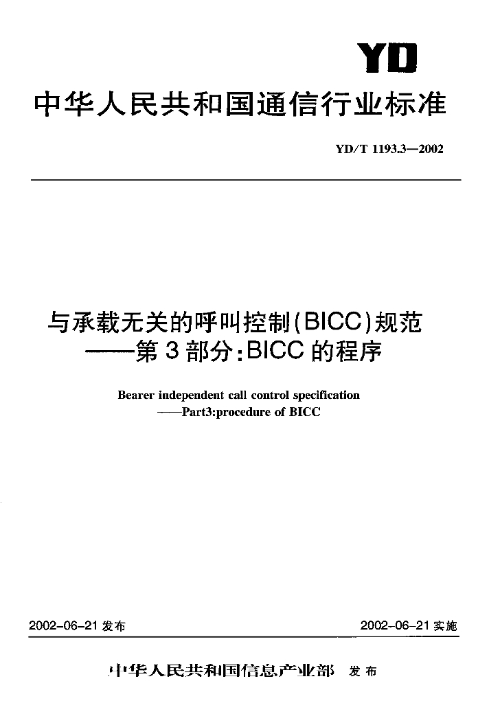 YD/T 1193.3-2002 与承载无关的呼叫控制(BICC)规范 第3部分:BICC 的程序