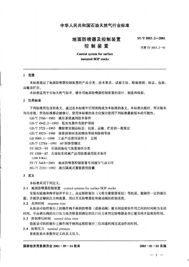 SY 5053.2-1991 地面防喷器及控制装置 控制装置