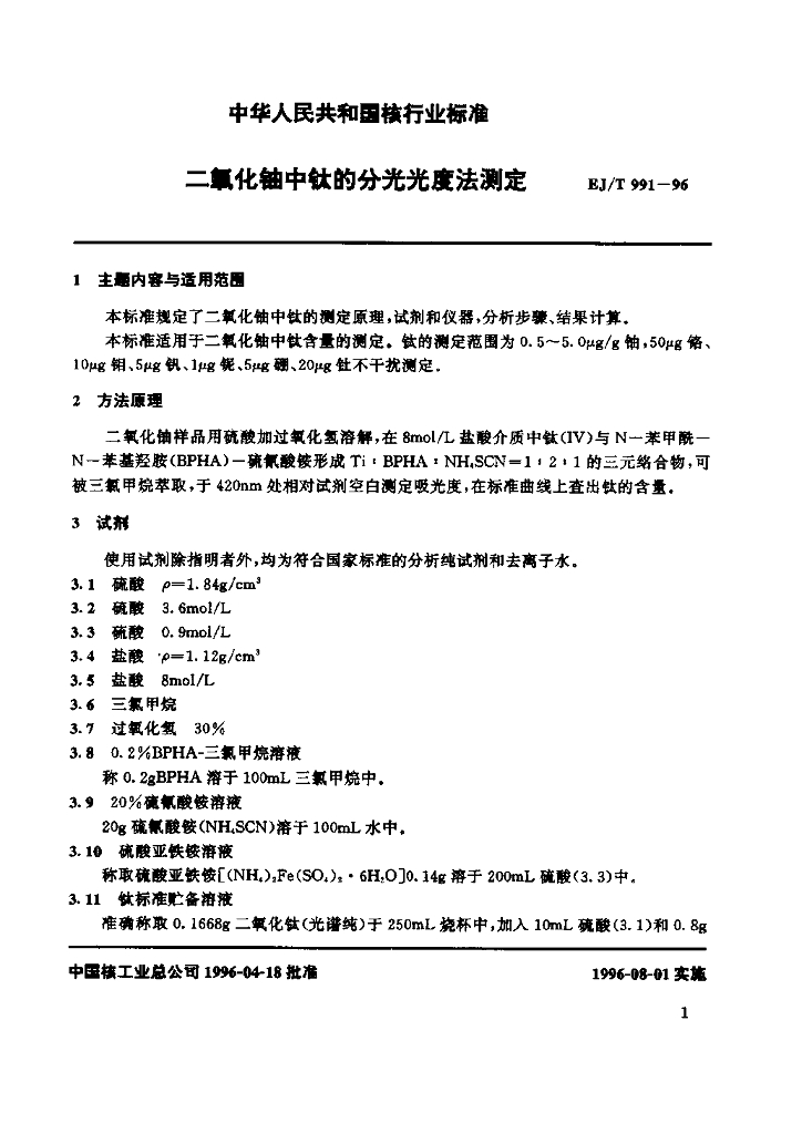 EJ/T 991-1996 二氧化铀中钛的分光光度法测定