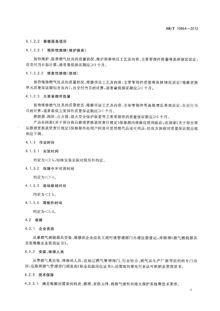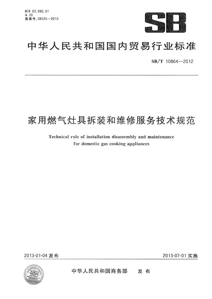 SB/T 10864-2012 家用燃气灶具拆装和维修服务技术规范