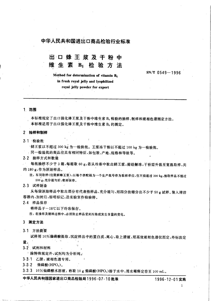 SN/T 0549-1996 出口蜂王浆及干粉中维生素B6检验方法