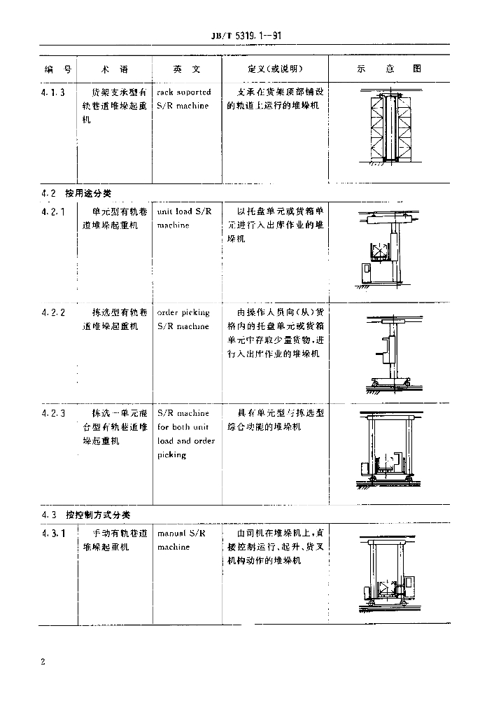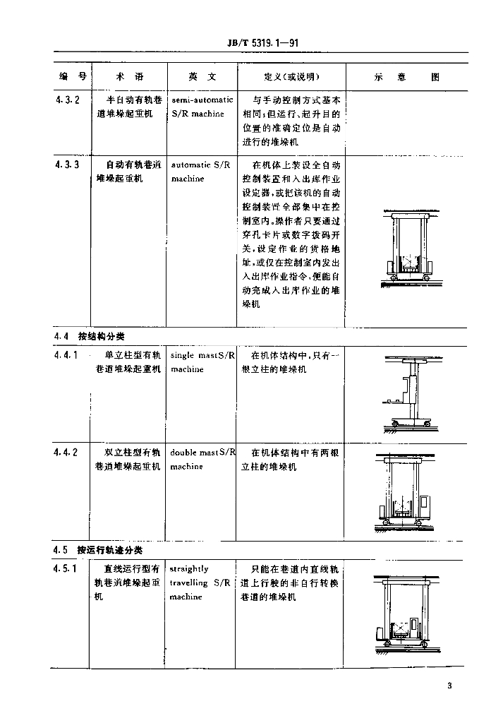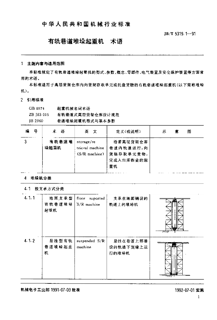 JB/T 5319.1-1991 有轨巷道堆垛起重机 术语
