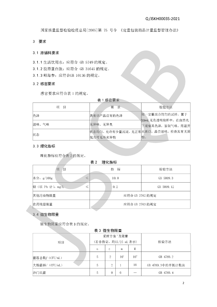 Q/JSKH 0003S-2021 鲜海参肽饮品